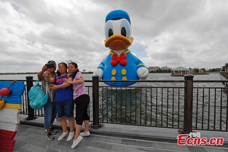 Visitors pose for photos with an 11-meter-tall Donald Duck in Wishing Star Lake at the Shanghai Disney Resort, July 12, 2018. (Photo/China News Service)