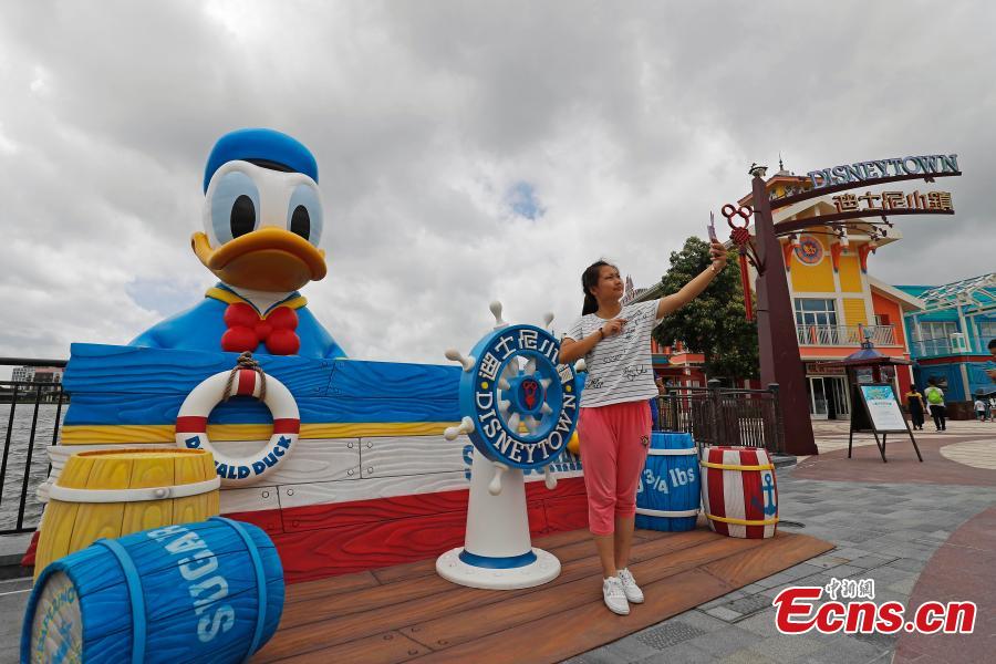 A visitor takes a selfie with an 11-meter-tall rubber Donald Duck in Wishing Star Lake at the Shanghai Disney Resort, July 12, 2018. (Photo/China News Service)