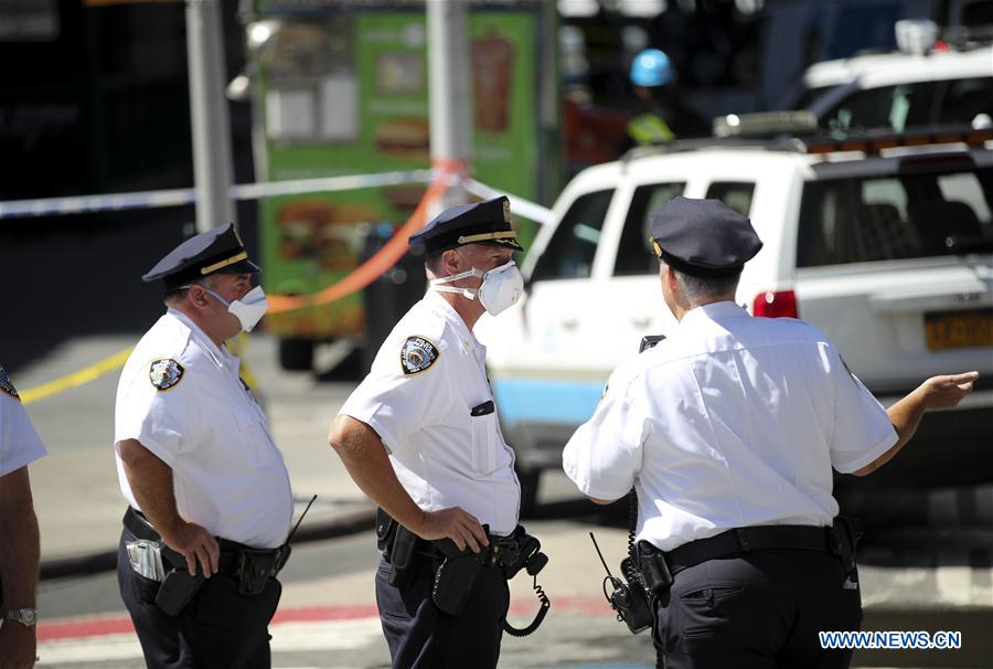 Police officers are seen with masks as they stand guard near the spot of a steam pipe explosion in New York, the United States, July 19, 2018. A neighborhood in Manhattan, New York City, was rocked Thursday morning when a steam pipe exploded, causing transit disruptions and street closures. No injuries were reported. The cause of the blast is under investigation. (Xinhua/Wang Ying)