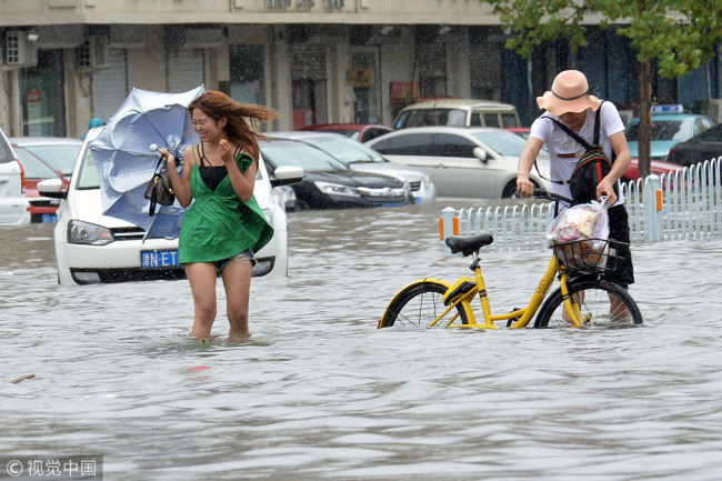 Heavy downpours brought on the remanence of tropical storm Ampil pounded Beijing and neighboring through early Tuesday, causing flight delays and evacuations. Beijing issued a yellow warning for heavy rain on Tuesday morning. [Photo: VCG]