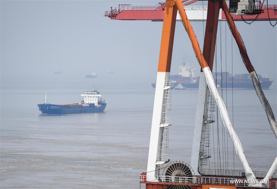 A freighter sails at Shanghai Yangshan deep water port, July 25, 2017. Located at the Hangzhou bay, Yangshan deep water port boosts Shanghai as an international maritime shipping center. [Photo/Xinhua]