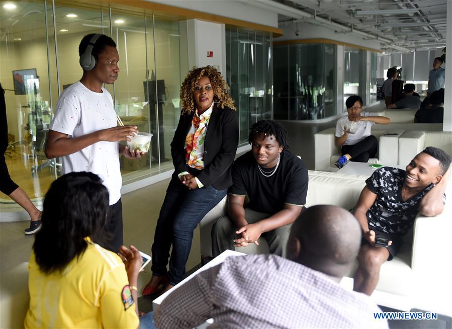 Hilda Malecela (3rd L) talks with colleagues at StarTimes Group in Beijing, capital of China, Aug. 14, 2018. Malecela comes from a rural family of Tanzania. She is a dubber of Chinese media company StarTimes. In 2016, she won a dubbing contest in Tanzania and got an opportunity to work at the headquarters of StarTimes. Malecela saw a movie of Jackie Chan in college and wanted to be engaged in film and television industry. After graduation, she became a dubber. The Swahili-dubbed Chinese television dramas in Tanzania provided a channel for Malecela to learn about Chinese culture. Besides dubbing, Malecela also learnt some skills about television in Beijing. "I have taught dubbing skills to my Tanzanian team," she said. Malecela hopes more and more African friends like Chinese culture. (Xinhua/Luo Xiaoguang)