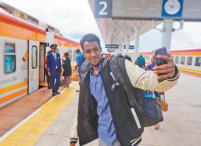 A passenger is taking a selfie at the Nairobi station of the Mombasa-Nairobi Standard Gauge Railway (SGR) in Kenya. (Photo by Wang Yunsong from People’s Daily)