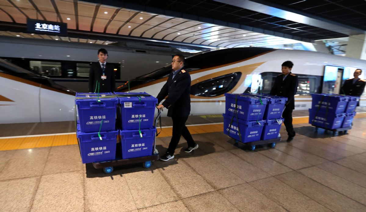 Employees of China Railway Express Co Ltd prepare to load packages onto a high-speed train in Beijing, under a partnership between the company and SF Express. [Photo by Zou Hong/For China Daily]