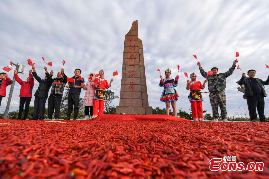 Farmers use eight tons of freshly-harvested peppers and corn to create a giant national flag on the top of Longquan Mountain in Zhejiang Province, Sept. 26, 2018, as part of harvest celebrations. The flag measured 10 meters in length and was 6.6 meters wide. The mountain is the highest peak in the Yangtze River Delta. (Photo: China News Service/Yang Yong)