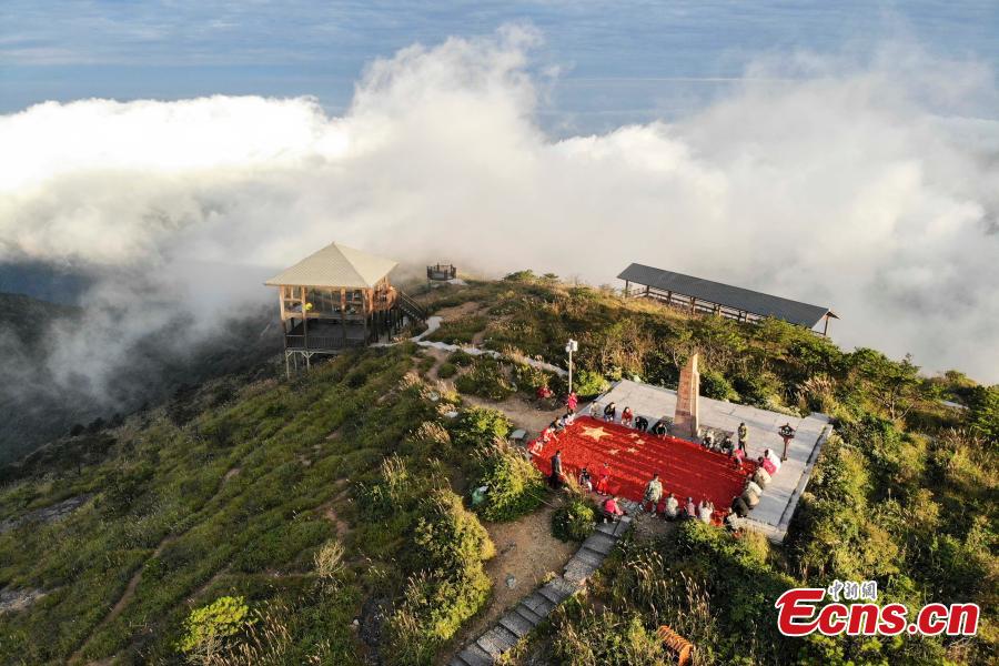 Farmers use eight tons of freshly-harvested peppers and corn to create a giant national flag on the top of Longquan Mountain in Zhejiang Province, Sept. 26, 2018, as part of harvest celebrations. The flag measured 10 meters in length and was 6.6 meters wide. The mountain is the highest peak in the Yangtze River Delta. (Photo: China News Service/Yang Yong)