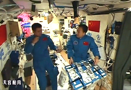 Chen Dong (left) and Jing Haipeng conduct an unusual experiment on board Tiangong II-drinking the first cup of tea in microgravity. [Photo/Xinhua]