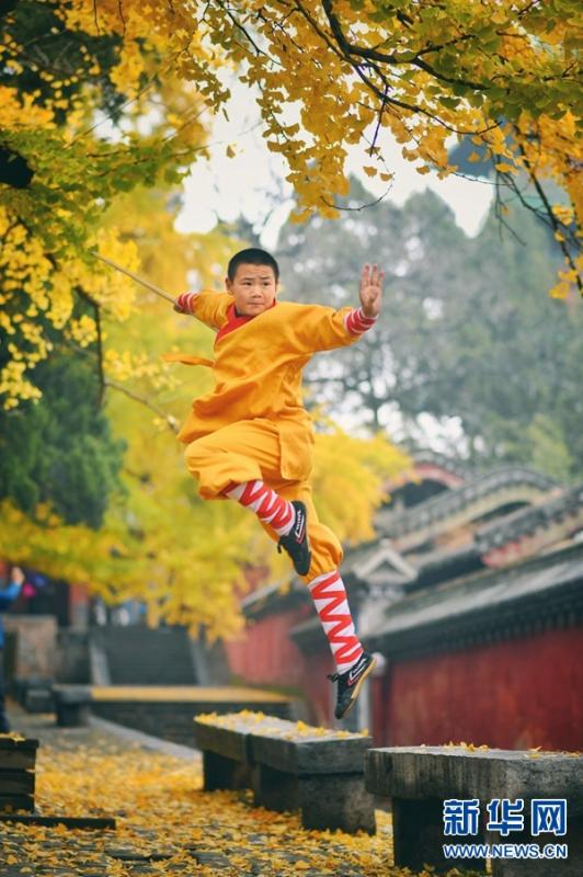 A monk practices martial arts under autumn leaves at the Shaolin Temple, located at the foot of Songshan Mountain, Henan Province, November 11, 2018. (Photo/Xinhua)