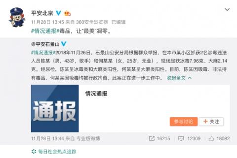 Police declined to confirm the singer's identity when contacted by China Daily on Wednesday afternoon. However, earlier that day, the weibo account of Beiijing Public Security Bureau reposted the original information with the comment, "Illegal drugs withered zuimei."