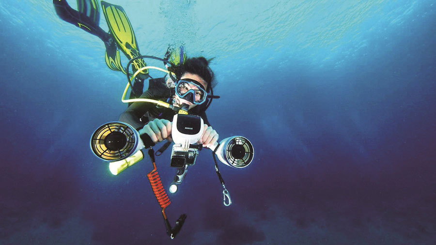 A diver uses an underwater booster developed by underwater robot producer Sublue. [Photo provided to China Daily]