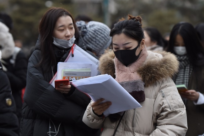 Postgraduate entrance exam candidates review their notes outside the examination hall, head of the start of the exam on Saturday, December 22, 2018 at Remnin University in Beijing. [Photo:CRI]
