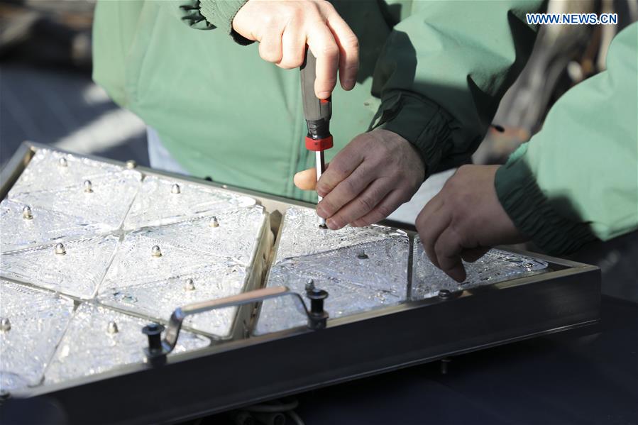 Workers install new crystal triangles on a panel of the New Year's Eve Ball during a ceremony on the roof of the One Times Square building in New York City, the United States, on Dec. 27, 2018. The iconic New Year's Eve Ball at New York City's Times Square had its latest decoration done on Thursday for the upcoming celebrations. For Times Square 2019, 192 Waterford Crystal triangles introduce the new Gift of Harmony design of small rosette cuts flowing into each other in beautiful harmony. Covered with a total of 2,688 Waterford Crystal triangles, the ball is 12 feet (3.66 meters) in diameter and weighs 11,875 pounds (5386.4 kilograms). (Xinhua/Wang Ying)