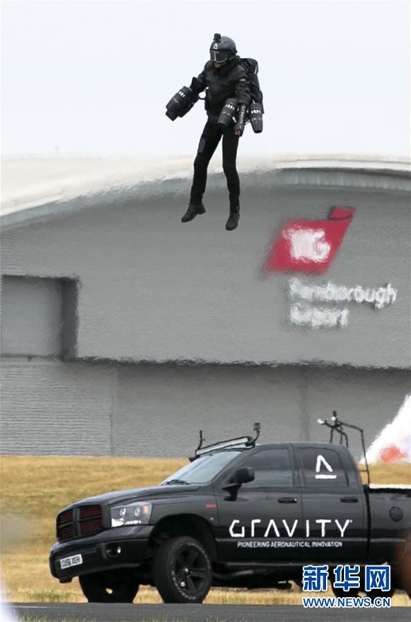 On July 22, a real-life Iron Man performs at the Farnborough International Air Show in the United Kingdom (UK). With small jet engines installed on his arms and back, the “Iron Man” can take off and land vertically and fly. (Photo/Xinhua)
