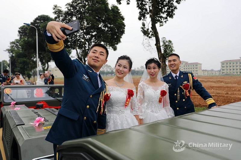 Newlyweds riding on pushback tractors take a selfie on the way to their military-style group wedding organized by the air force under the PLA Southern Theater Command at a military camp on December 23, 2018. (eng.chinamil.com.cn/Photo by Fan Yishu)