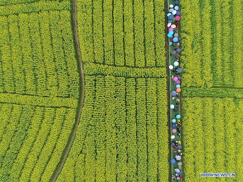 Tourists enjoy the view of cole flowers in the field of Huashan Village in Kuzongqiao Township of Hengyang County, central China's Hunan Province, March 17, 2018. (Xinhua/Cao Zhengping)
