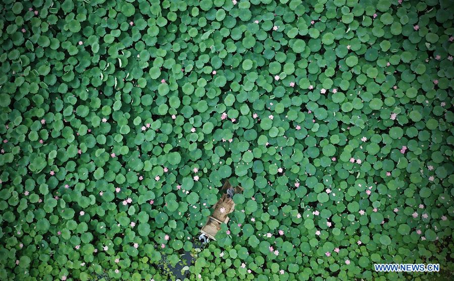 Areial photo taken on July 1, 2018 shows a lotus pond in Nanpingzhuang Village, Luan County of Hebei Province. (Xinhua / Mou Yu)