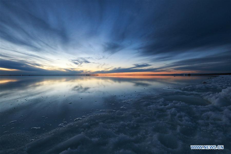 A sunset afterglow is cast over the Qairhan Salt Lake in northwest China's Qinghai Province, Aug. 18, 2018. Abundant in mineral resources, Qairhan Salt Lake is a production base of potash fertilizer in China. (Xinhua/Tian Wenjie)