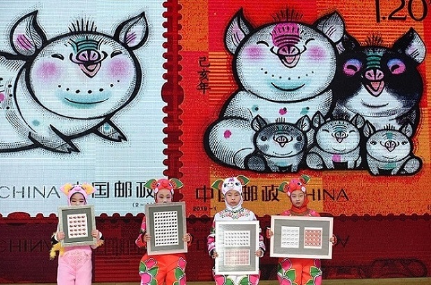 Kids present special zodiac stamps for the lunar year of the Pig in Nanjing, capital of East China's Jiangsu province, Jan 5, 2019. China Post on Saturday issued a set of special zodiac stamps in honor of 2019 Chinese Lunar New Year, or the Year of the Pig. The Year of the Pig starts from Feb 5, 2019. (Xinhua/Sun Can)