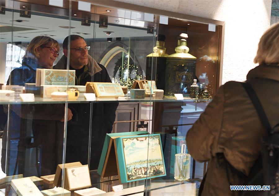 Visitors look at some Eau de Cologne exhibits at a fragrance museum in Cologne, Germany, on Jan. 4, 2019. Eau de Cologne is a perfume with a concentration of about 3% essential oils, which was originally launched by Johann Maria Farina in 1709 in Cologne, Germany. It has since come to be a worldwide renowned perfume. (Xinhua/Lu Yang)