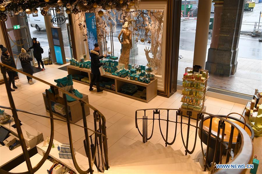 People visit a perfume store selling Eau de Cologne in Cologne, Germany, on Jan. 4, 2019. Eau de Cologne is a perfume with a concentration of about 3% essential oils, which was originally launched by Johann Maria Farina in 1709 in Cologne, Germany. It has since come to be a worldwide renowned perfume. (Xinhua/Lu Yang)