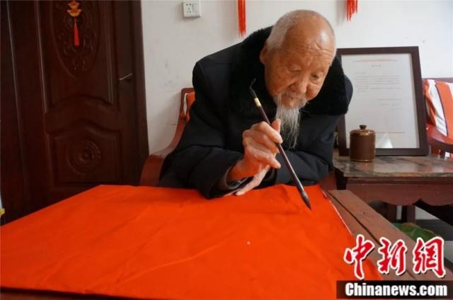 Zhang Xueli, a 117-year-old in Jiaxian county, Henan province, shows the Chinese calligraphy he has written. [Photo/Chinanews.com]