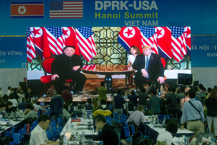 Journalists at the media center watch live broadcast of top leader of the Democratic People's Republic of Korea Kim Jong-un meeting with US President Donald Trump in Hanoi, Vietnam, on Feb 28, 2019. Roy Liu / China Daily