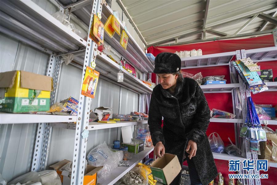 Renaguli sorts out goods at her grocery. (Photo/Xinhua)