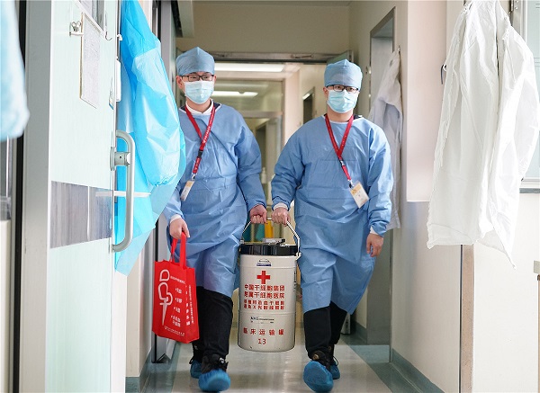 Medical staff carry a cylinder containing the hematopoietic stem cells from the China Stem Cell Group. [Photo provided to chinadaily.com.cn]
