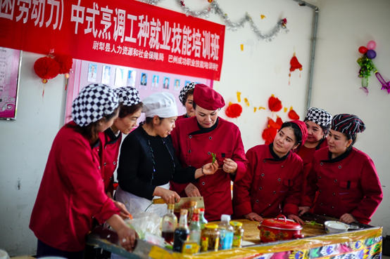 On February 23, 2019, the vocational training school teacher (third from left) explained the cooking knowledge to the students in the Tarim Village, northwest China's Xinjiang Uygur Autonomous Region. (Photo: Li Fei, People’s Daily Online)