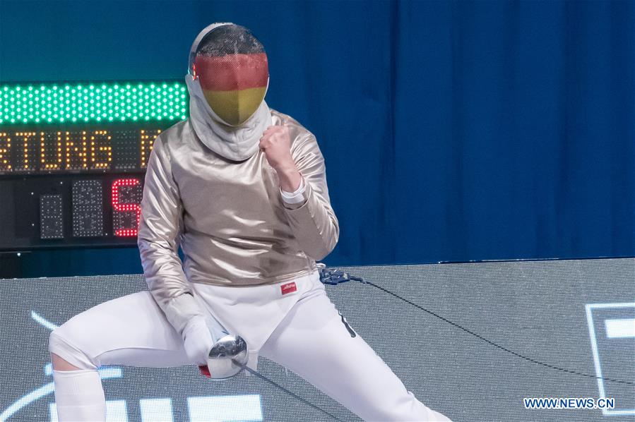 Max Hartung of Germany celebrates scoring during the final against Oh Sanguk of South Korea of the Gerevich-Kovacs-Karpati Men's Sabre World Cup in Budapest, Hungary on March 23, 2019. (Xinhua/Attila Volgyi)