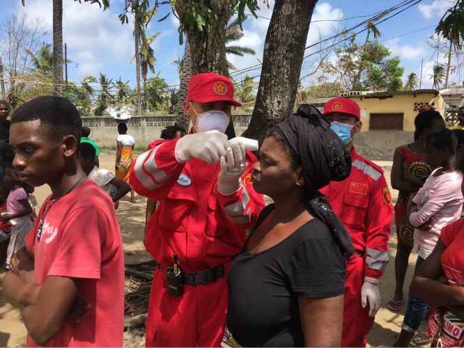 A medical member of the Chinese rescue team measures a woman's body temperature at a temporary shelter for victims of Cyclone Idai in Beira, Mozambique, March 27, 2019. The Chinese rescue team has provided medical treatment to more than 500 people, and delivered 60 liters of drinking water and other materials to 1,000 affected people since March 25, after Cyclone Idai wreaked havoc in the southeastern African country. (Photo provided by the Ministry of Emergency Management)