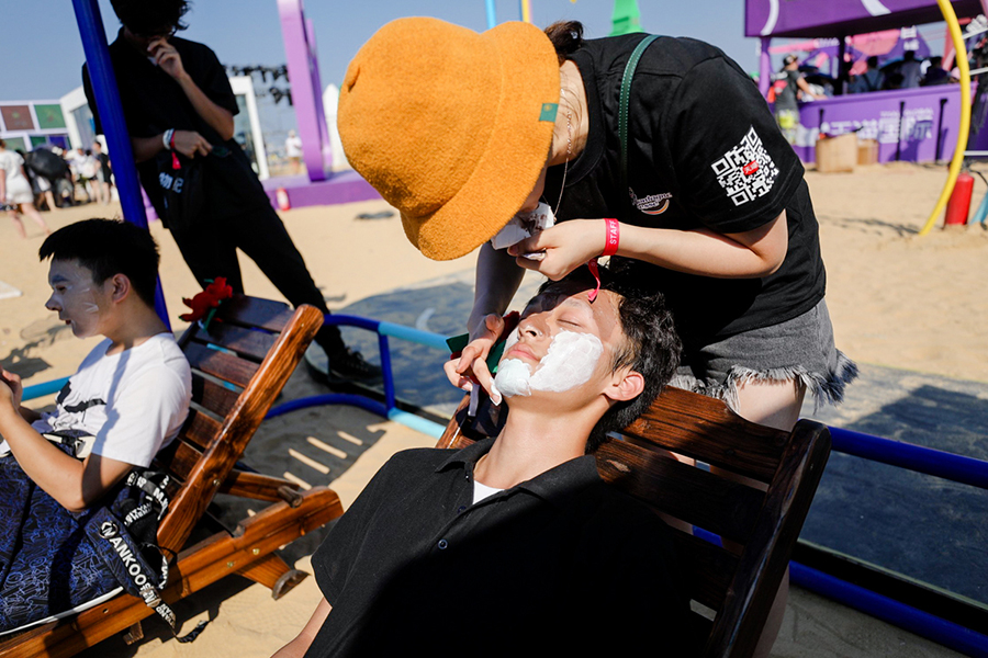 Men try out face masks on a beach in Jinshan district, Shanghai. [Photo provided to CHINA DAILY]