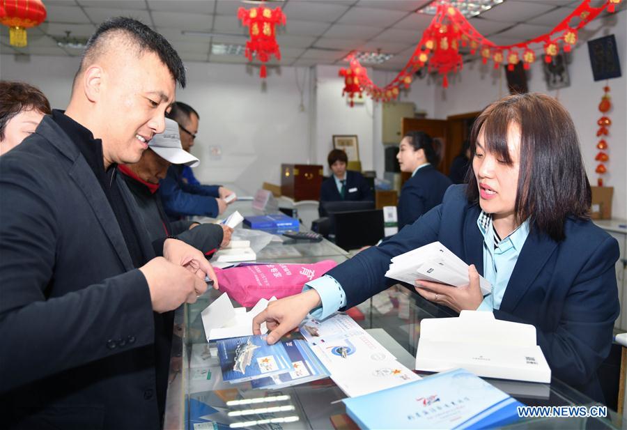 Citizens buy commemorative envelopes at a shop in Qingdao, east China's Shandong Province, April 23, 2019. A set of philatelic items were issued on Tuesday to mark the 70th founding anniversary of the Chinese People's Liberation Army (PLA) Navy. (Xinhua/Zhu Zheng)