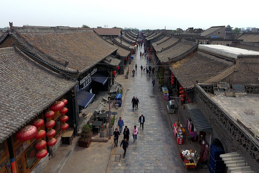 In this aerial photo taken on May 7, 2019, tourists visit Pingyao, north China's Shanxi Province. Pingyao, a UNESCO World Cultural Heritage site in north China's Shanxi Province, is famous for its well-preserved ancient architecture including the city walls. (Xinhua)