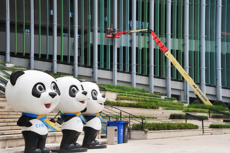On July 28, 2019, the day was the 99th countdown to the second China International Import Expo. Workers climbed the exterior of the stadium at the National Convention and Exhibition Center (Shanghai). (People's Daily Online/Yang Jianzheng)