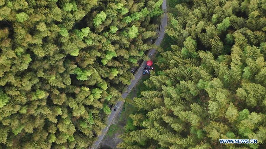 Aerial photo taken on Aug. 3, 2019 shows visitors walking on a footpath in the Mukeng bamboo forest scenic area in Yixian County of Huangshan, east China's Anhui Province. (Xinhua/Zhang Duan)