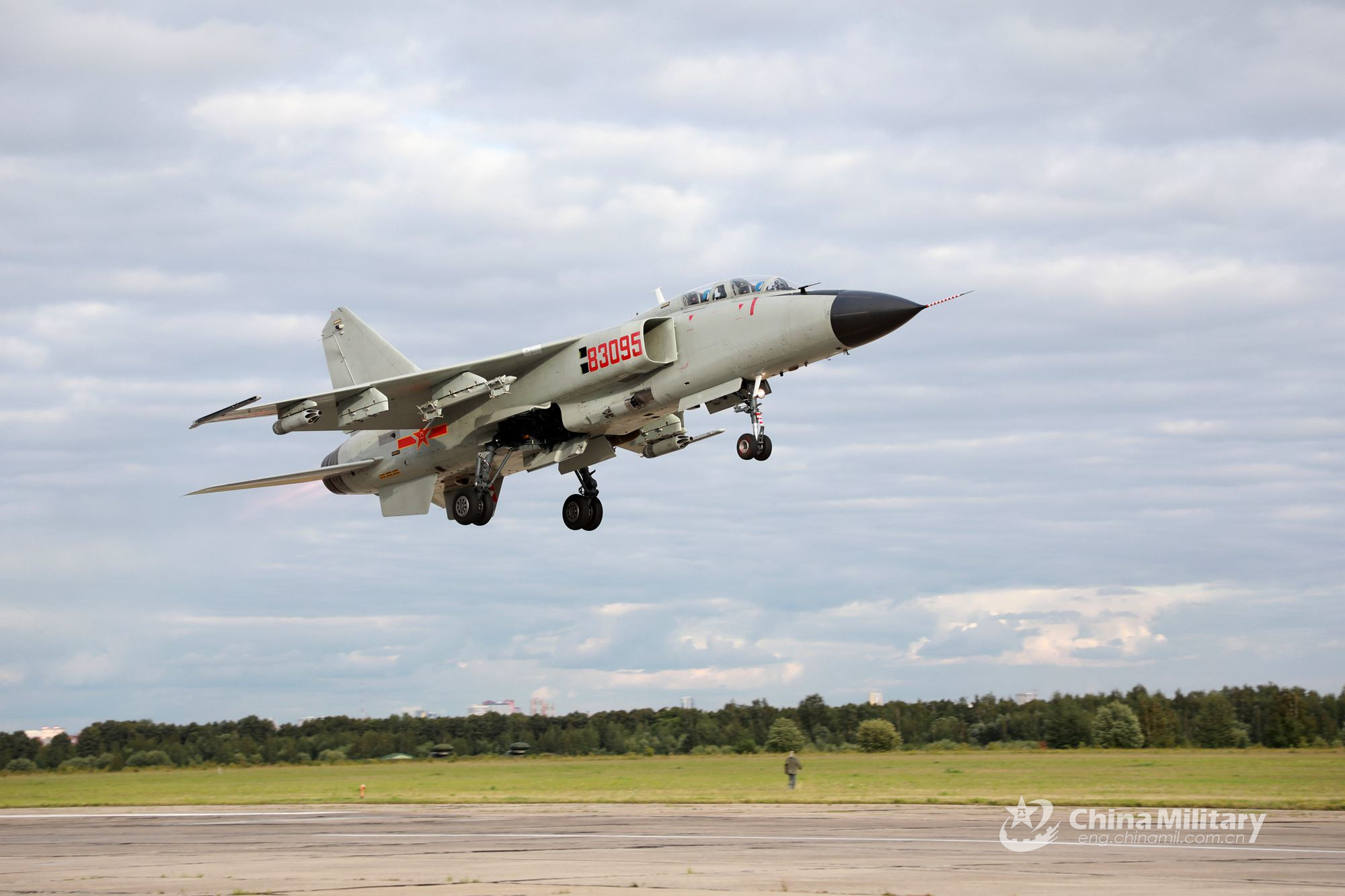 A JH-7A fighter jet attached to a naval aviation brigade under the PLA Navy takes off from the airport on August 1, 2019. All aircraft of the PLA naval aviation troops participating in the "Aviadarts-2019" international competition of the International Army Games 2019 have arrived at the Dyagilevo military airport in Ryazan Oblast, Russia for pre-competition warm ups. (eng.chinamil.com.cn/Photo by Gao Hongwei and Wang Bin)
