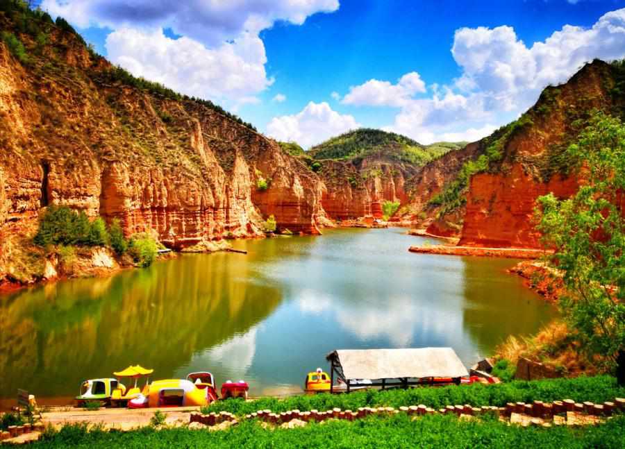 A lake surrounded by stunning cliffs is pictured in Heimapo Red-earth Geopark in Liulin county, North China's Shanxi Province. (Photo by Wang Fengyun/for chinadaily.com.cn)