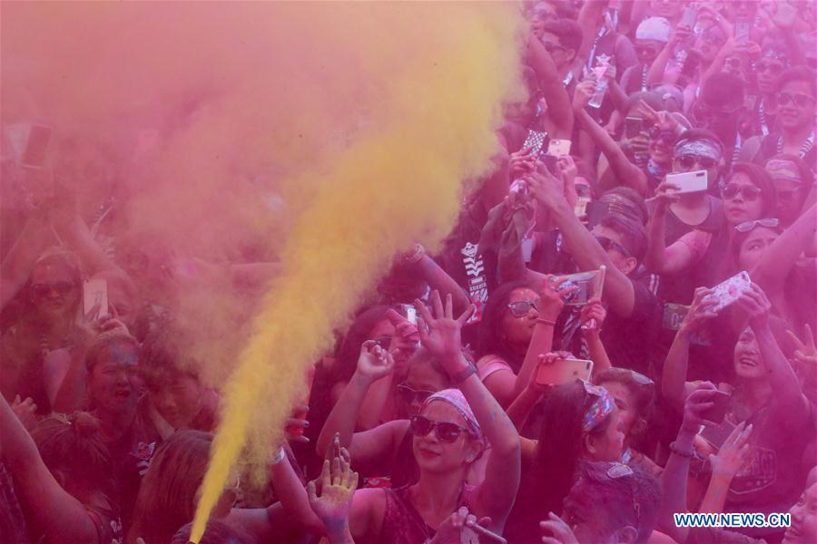 Runners celebrate during the 2019 Color Manila Challenge in Pasay City, the Philippines, Aug. 18, 2019. Thousands of people participated in the fun run which involves running through various obstacles aiming to promote a healthier lifestyle. (Xinhua/Rouelle Umali)