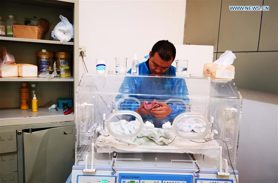 A staff member takes care of a panda cub at the Hetaoping panda base in Wolong, southwest China's Sichuan Province, Aug. 21, 2019. A pair of male panda twins were born to both captive and wild parents in Sichuan Tuesday, according to China Conservation and Research Center for the Giant Panda. Panda Cao Cao, 17, gave birth to the twins. Rescued from the wild in 2002, Cao Cao grew up in captivity. She was released into the wild in March and mated with a wild panda in April, as scientists tried to increase genetic diversity of captive pandas, according to the center. (Xinhua)