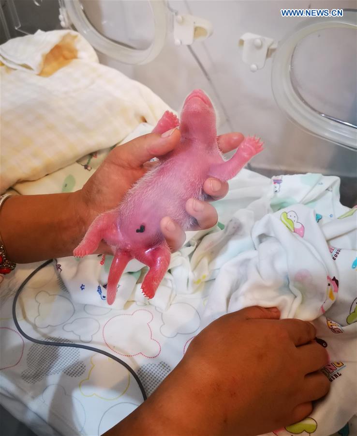 Photo taken on Aug. 21, 2019 shows a new-born panda cub at the Hetaoping panda base in Wolong, southwest China's Sichuan Province. A pair of male panda twins were born to both captive and wild parents in Sichuan Tuesday, according to China Conservation and Research Center for the Giant Panda. Panda Cao Cao, 17, gave birth to the twins. Rescued from the wild in 2002, Cao Cao grew up in captivity. She was released into the wild in March and mated with a wild panda in April, as scientists tried to increase genetic diversity of captive pandas, according to the center. (Xinhua)
