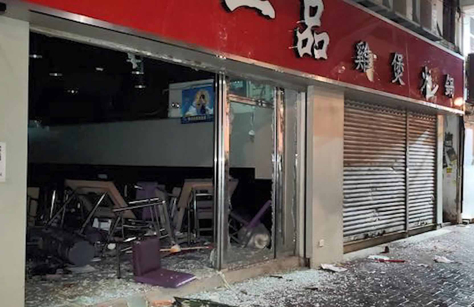 According to Orange News, a Hong Kong news portal, at around 7:40 pm, a group of protestors, equipped with iron bars, clubs and bricks, attacked several shops along the street, wrecking at least one restaurant and one mahjong shop.