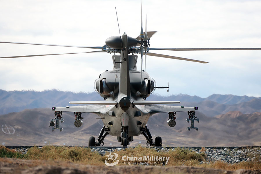 An attack helicopter loading with ammunition attached to an aviation brigade under the PLA Xinjiang Military Command prepares to lift off from the parking apron during a live-fire flight training exercise over the northern foot area of the Tianshan Mountains on September 11, 2019.