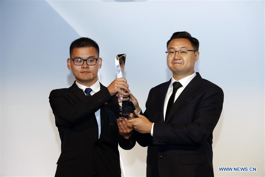 Xu Di (R), general manager of the Ant Forest initiative, and Shen Junliang, a representative app user, pose for photos after receiving a 2019 "Champions of the Earth" award, in New York, the United States, Sept. 26, 2019. Ant Forest, a green initiative in China, on Thursday received a 2019 "Champions of the Earth" award, the United Nations highest environmental honor. Ant Forest won the "Inspiration and Action" category of the award given by the UN Environment Program (UNEP) for turning the green good deeds of half a billion people into real trees planted in some of China's most arid regions. (Xinhua/Li Muzi)