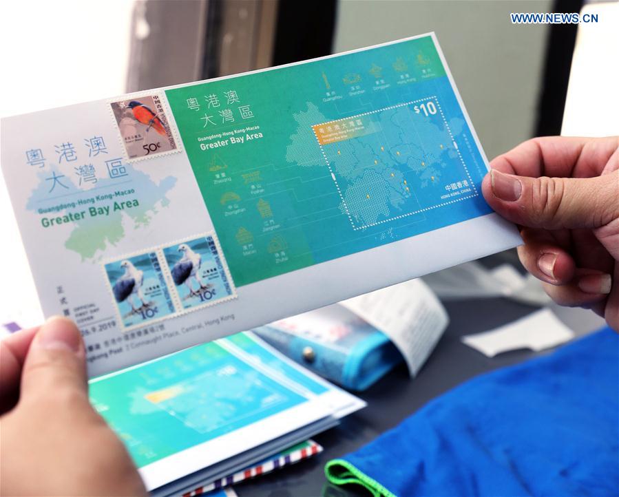 A resident prepares to post a first day cover with a "Guangdong-Hong Kong-Macao Greater Bay Area" special stamp at Hong Kong General Post Office in south China's Hong Kong, Sept. 26, 2019. The "Guangdong-Hong Kong-Macao Greater Bay Area" special stamp sheetlets were issued on Thursday in post offices of Hong Kong, Guangzhou and Macao. (Xinhua/Luo Huanhuan)