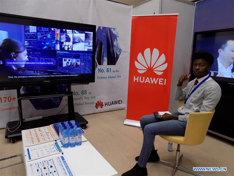 Photo taken on Oct. 8, 2019 shows the stand of China's telecommunication giant Huawei at the 6th National ICT Summit held in Windhoek, Namibia. Namibia hosted the 6th National ICT Summit under the theme: "Accelerating Digital Transformation in Namibia", from Oct. 7 to 9 in Windhoek. (Photo by Musa C Kaseke/Xinhua)