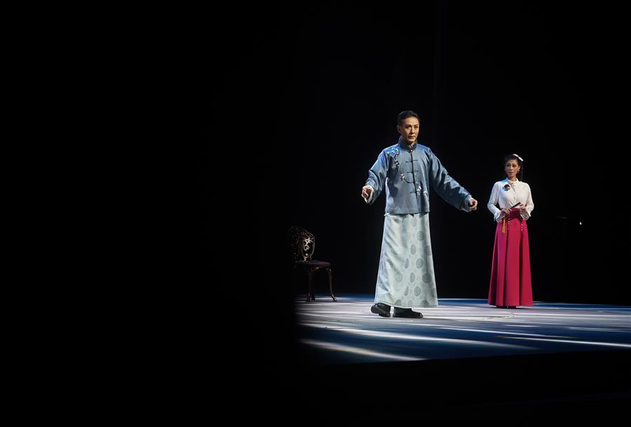 Performers act in an original modern Kunqu opera show depicting the early life of Peking opera master Mei Lanfang in Nanjing, capital of east China's Jiangsu Province, Oct. 9, 2019. (Xinhua/Ji Chunpeng)