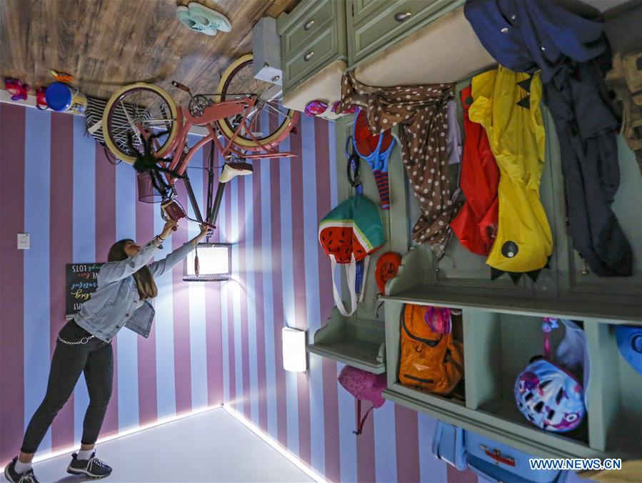 A visitor poses for photos in the Upside Down House at the Museum of Illusions in Los Angeles, the United States, on Oct. 9, 2019. Located at Hollywood of Los Angeles, the Upside Down House features seven upside down rooms, attracting lots of visitors. (Xinhua/Li Ying)