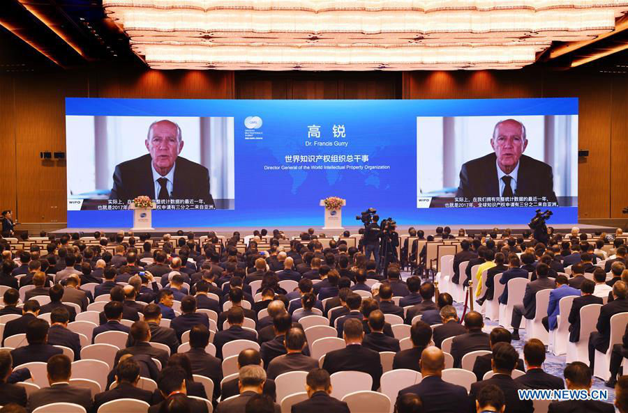 Francis Gurry, Director General of the World Intellectual Property Organization, speaks via video during the opening ceremony of the first Qingdao Multinationals Summit in Qingdao, east China's Shandong Province, Oct. 19, 2019. The first Qingdao Multinationals Summit is jointly held by the Ministry of Commerce and the Shandong provincial government. Themed "Multinationals and China," the summit will hold closed-door meetings, parallel panels and parallel road shows. (Xinhua/Li Ziheng)