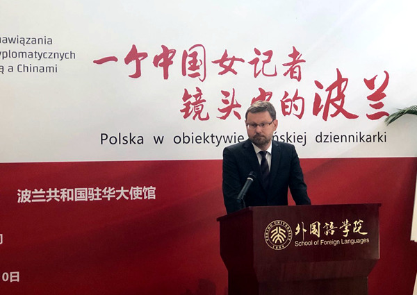 Piotr Gillert, Deputy Head of the Embassy of the Republic of Poland in Beijing, addresses the opening ceremony of the "Poland through the lens of a female Chinese journalist" photo exhibition, October 28, 2019. (People's Daily Online/Du Mingming)